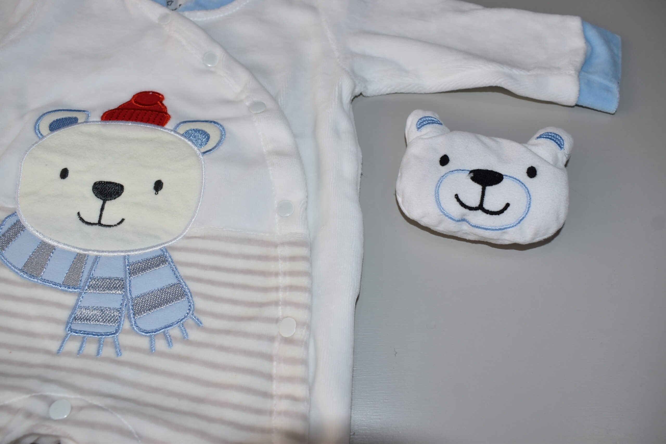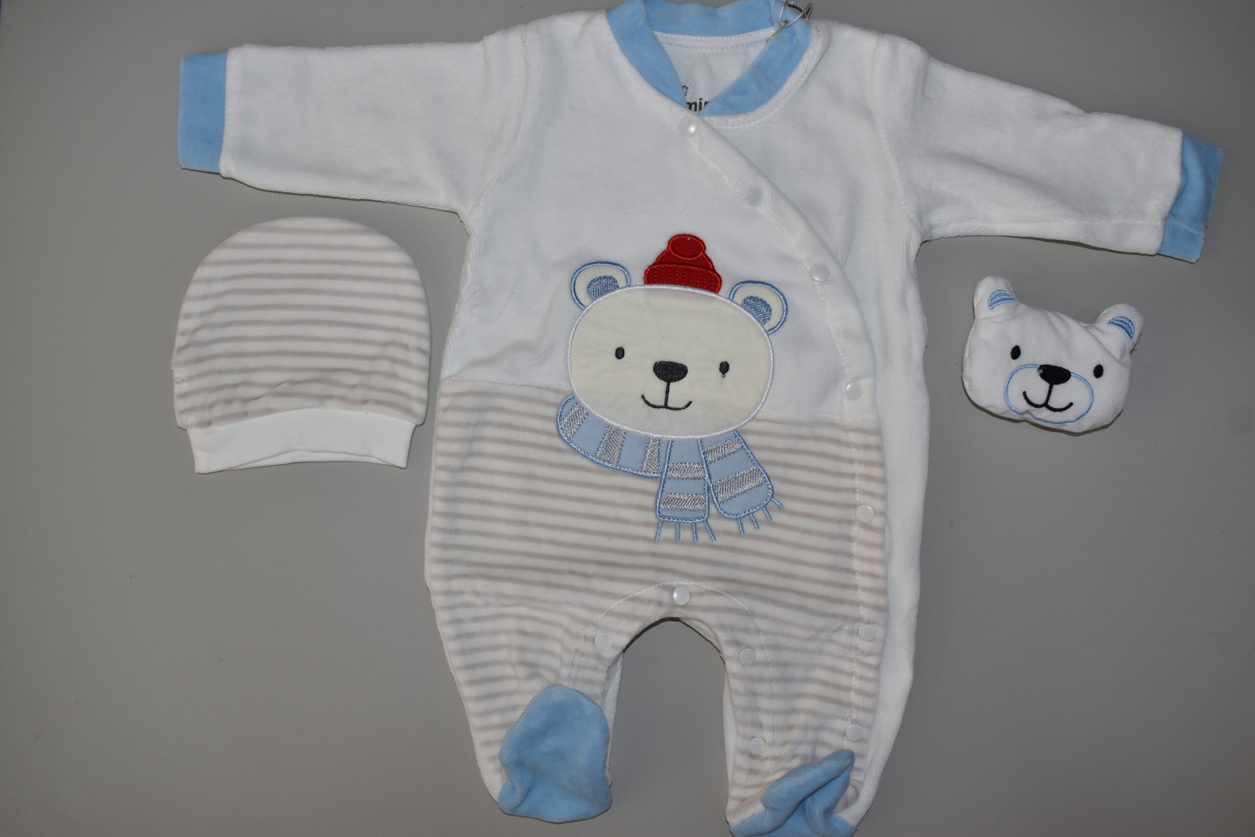 Βελούδινο ολόσωμο φορμάκι παιδικό συνοδεύεται με σκουφάκι και πάνινο παιχνίδι